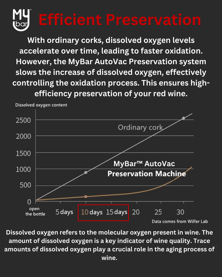 MyBar AutoVac system maintains lower levels of dissolved oxygen for at least 15 days, suggesting that wine can be preserved for at least this duration with reduced oxidation and maintained quality.